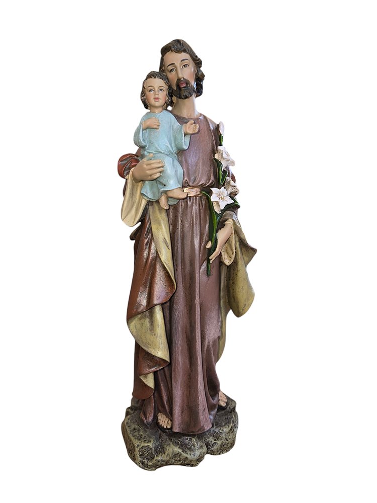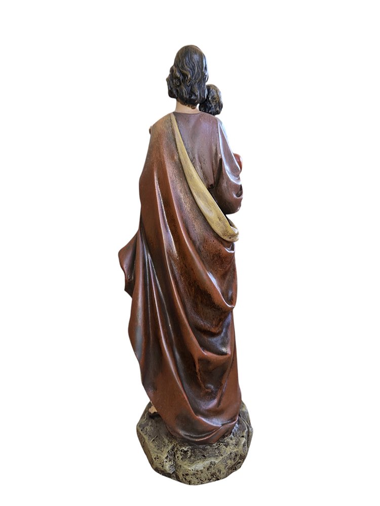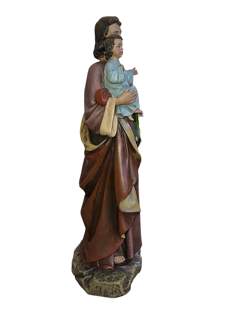 Crafted from durable resin, this touching depiction of San José tenderly holding the child Jesus captures the essence of his role as the guardian and protector of the Holy Family. With gentle features and a loving gaze, he radiates warmth and paternal care. The child Jesus, nestled securely in his arms, looks up with trust and affection, symbolizing the deep bond between them. Adorned with intricate details, the sculpture reflects a life of humility, devotion, and steadfast faith. As the patron saint of workers and families, this image of San José provides inspiration and solace, serving as a timeless reminder of his dedication and love.