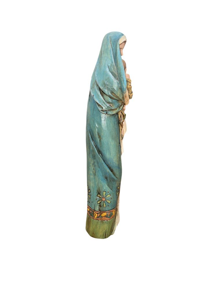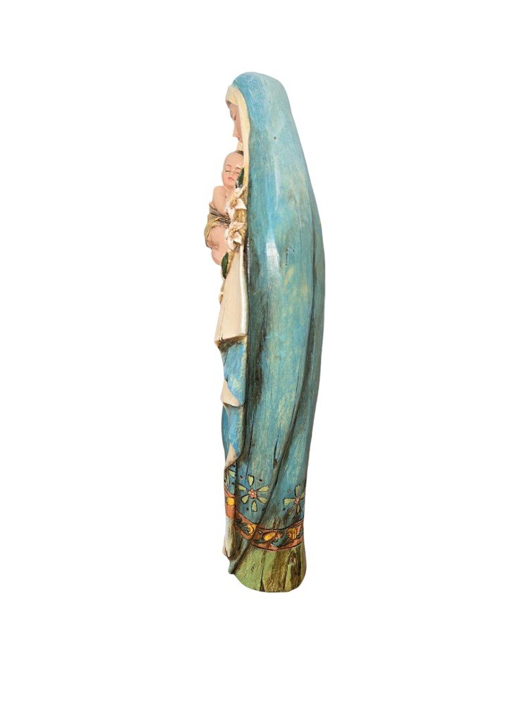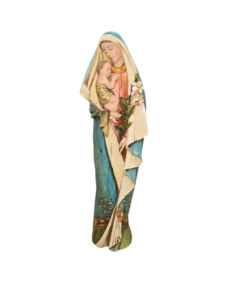 This beautiful statue from Joseph’s Studio is brightly painted on carved wood. The Blessed Virgin Mary is depicted with eyes closed as she sweetly lowers her face towards the Child Jesus, who is lovingly in her arms. She holds an Easter Lily, which is symbolic of Mary’s purity as well as Jesus’ resurrection.