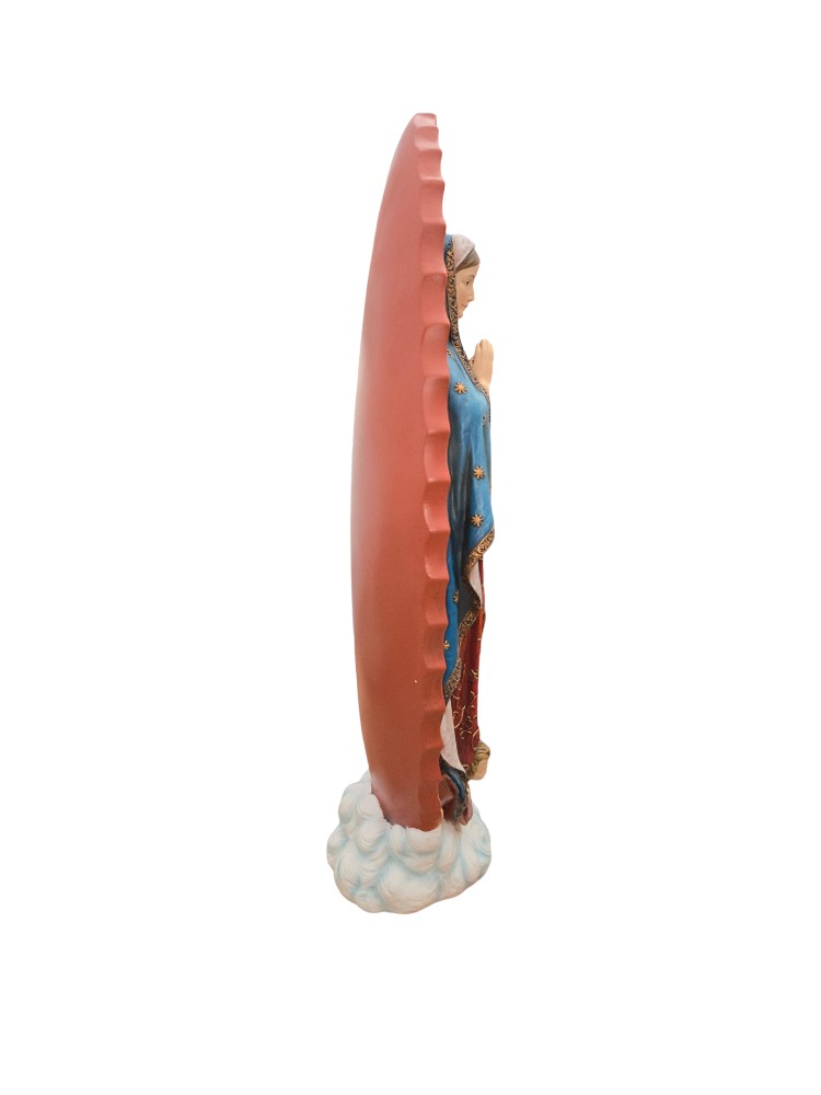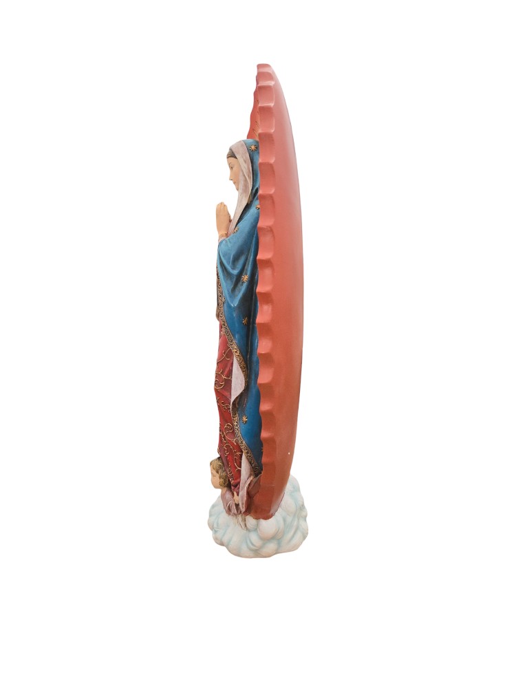 Our Lady of Guadalupe is surrounded by rays of sun and stands upon the moon, wearing a robe of stars and garments of royal colors, and there is a little angel at her feet.
