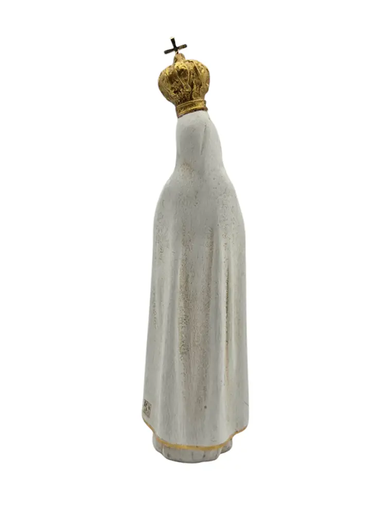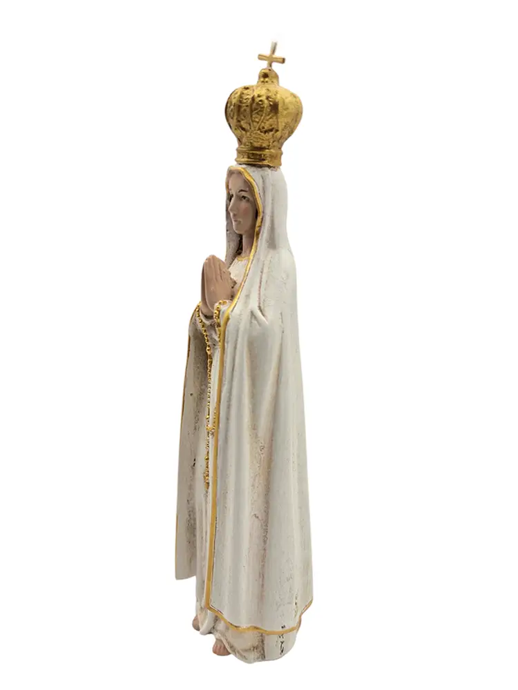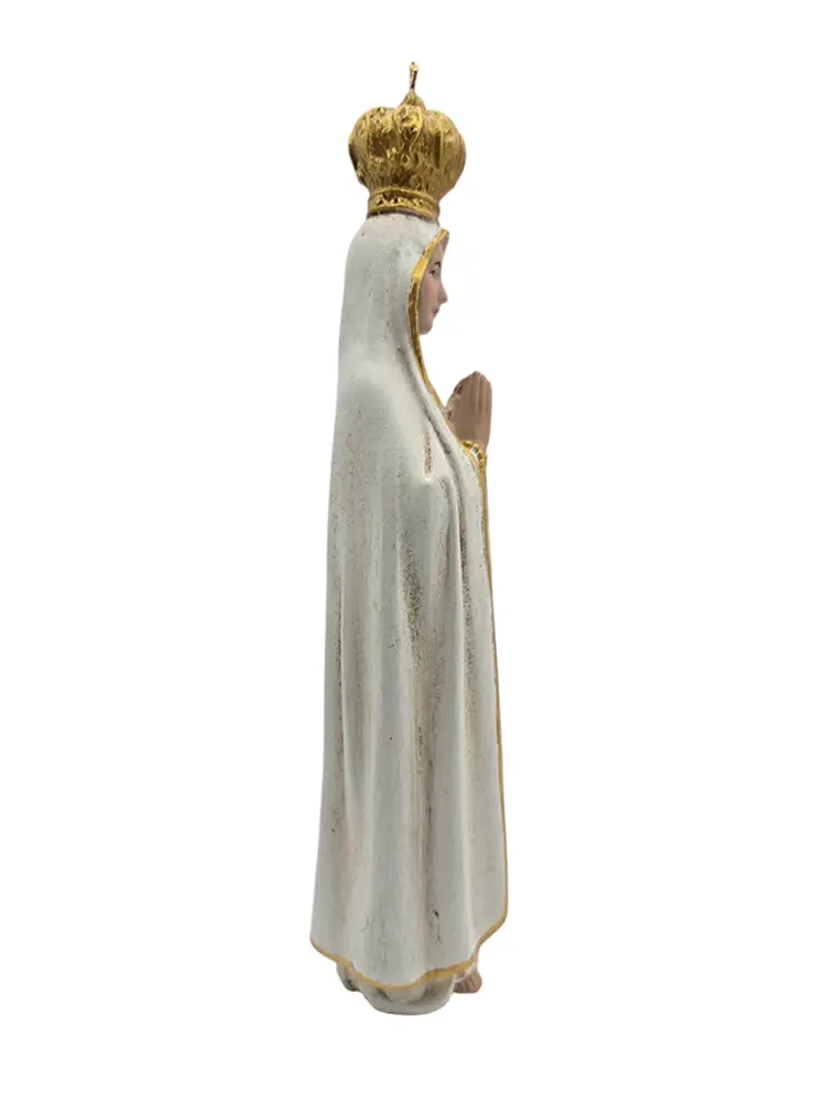 This lovely figure depicts Our Lady of Fatima folding the hands in prayer in cream robes with gold trim. Measures approximately 7″ high x 2″ wide x 1.75″ deep.