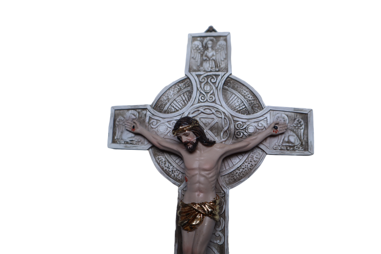 This crucifix features a neutral colored cross with angels carved into the ends, the unending knot design and full-color corpus. Highly detailed and comes with a hanger on back for ease in hanging.