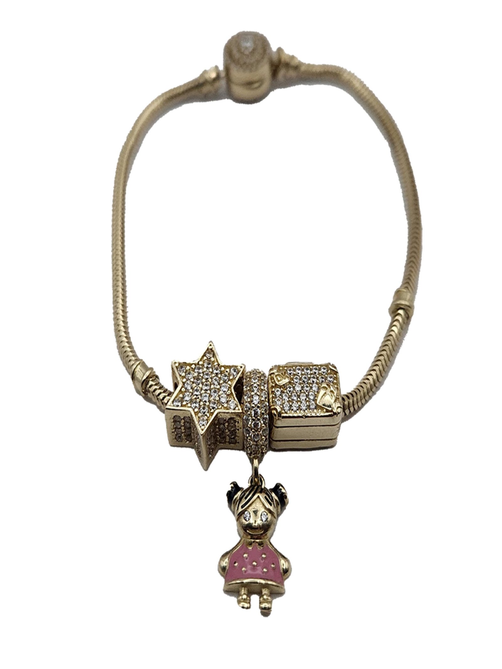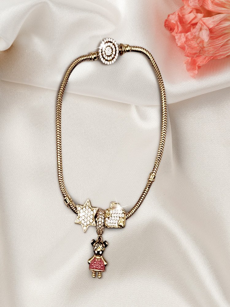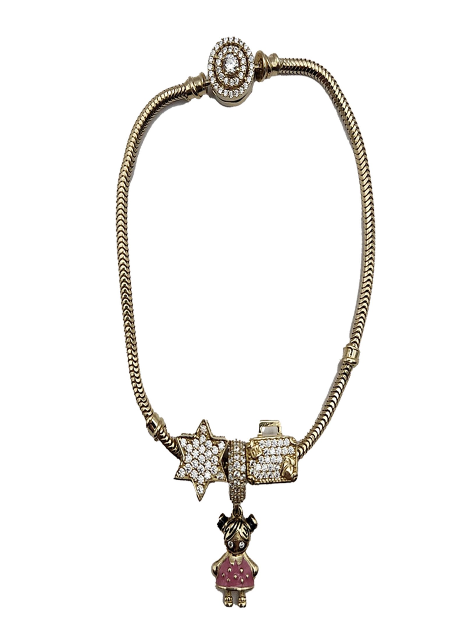 This charm bracelet is made from 14k Italian gold and features a star charm with white stones, a travel-inspired luggage charm, and a playful girl charm.