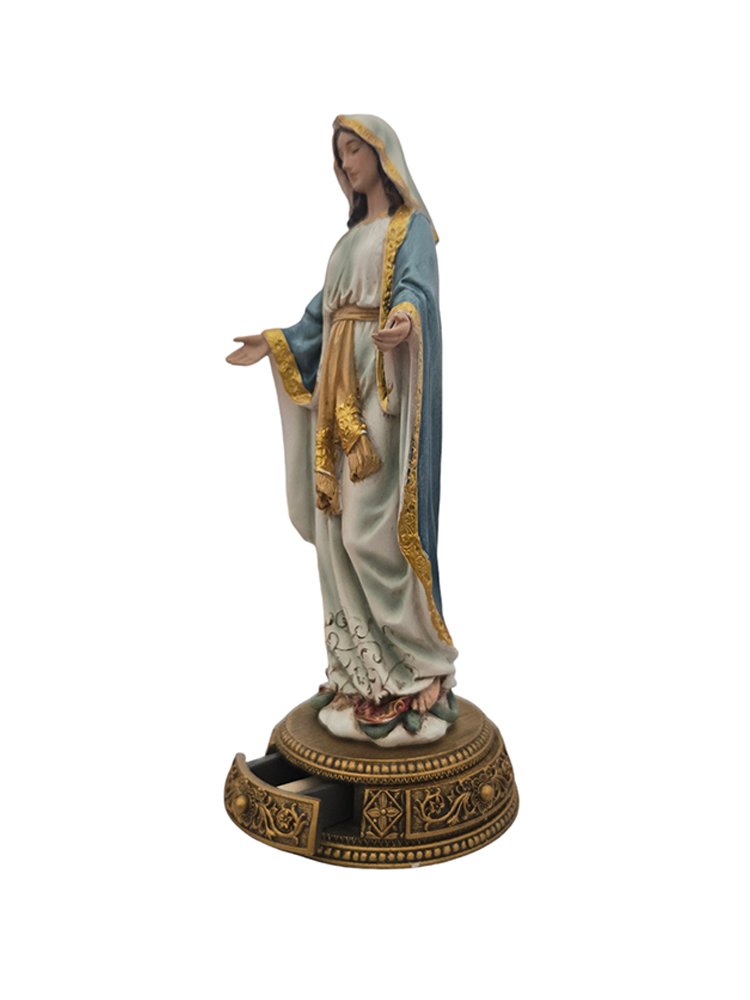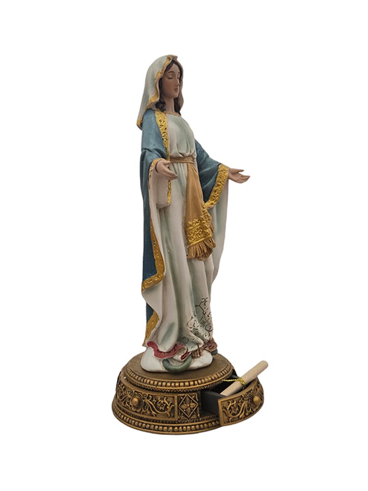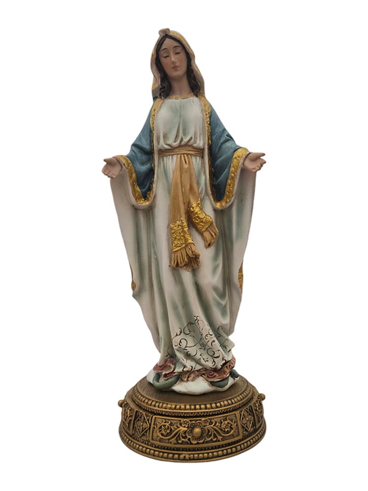 The statue of Our Lady of Grace, made of resin and measuring approximately 102.5’’ tall, radiates purity and heavenly closeness. With welcoming arms, it offers maternal comfort and protection. Includes scroll in base drawer.