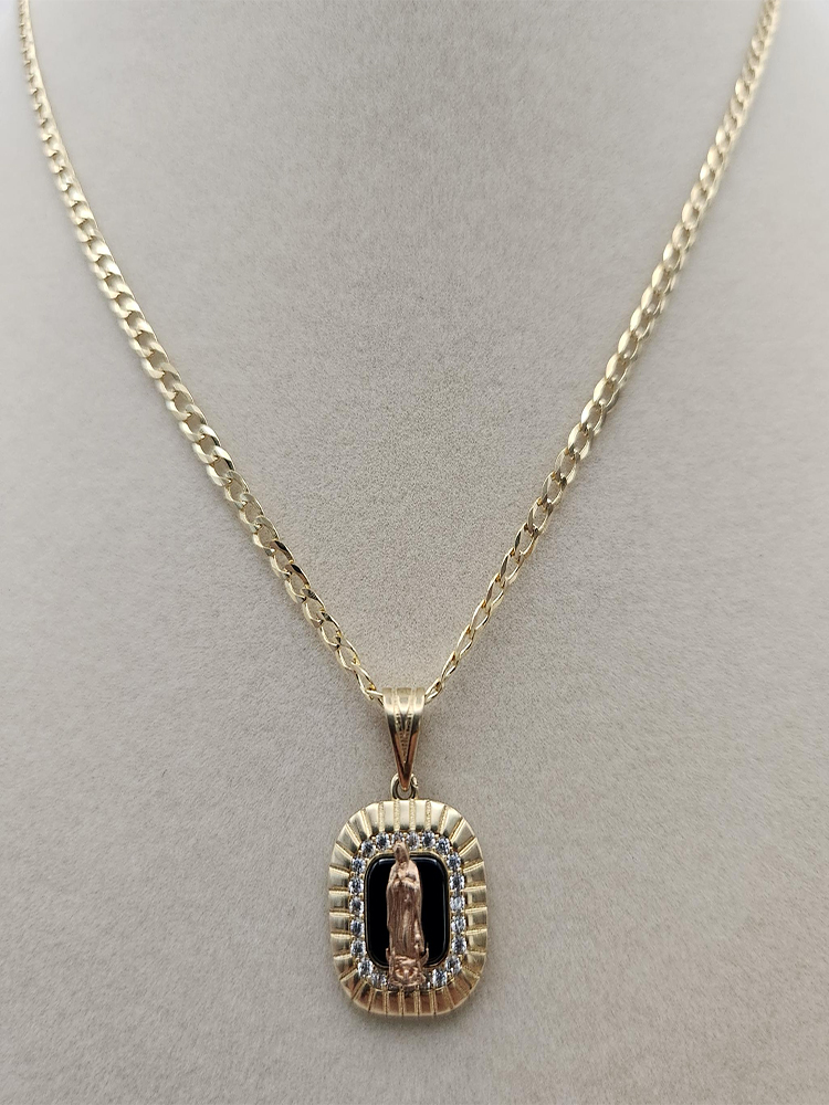 This beautifully 14K Italian gold crafted square pendant features a raised image of Our Lady of Guadalupe, set against a black background and framed by large, high-quality cubic zirconia, making the Virgin’s image truly stand out.