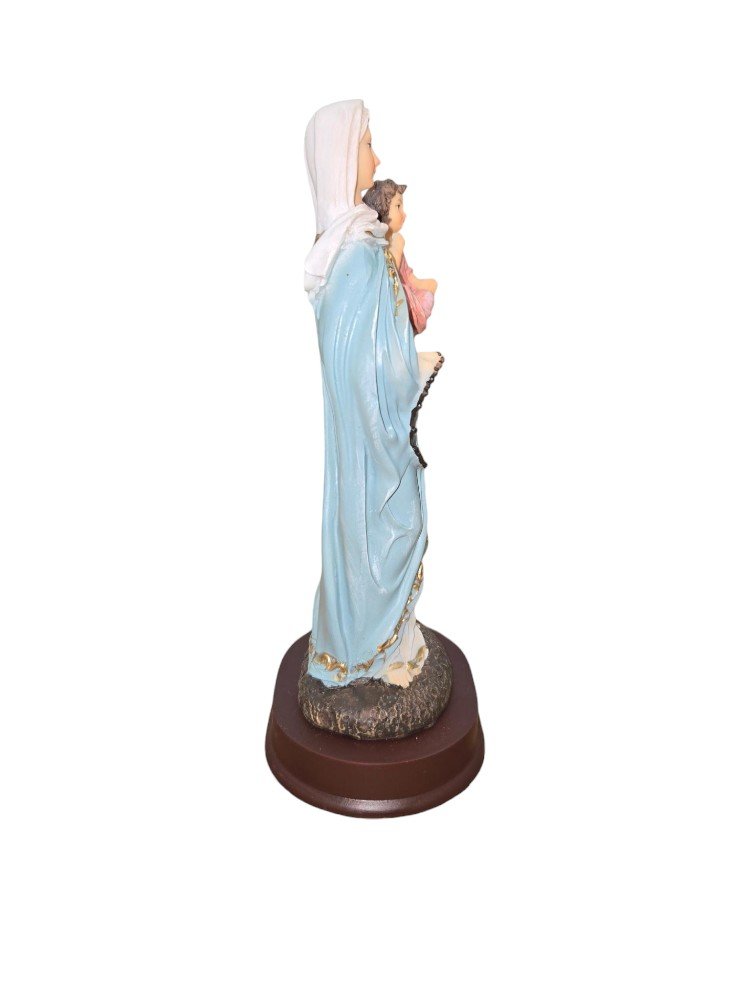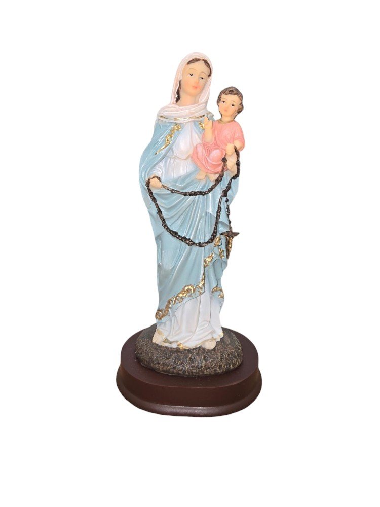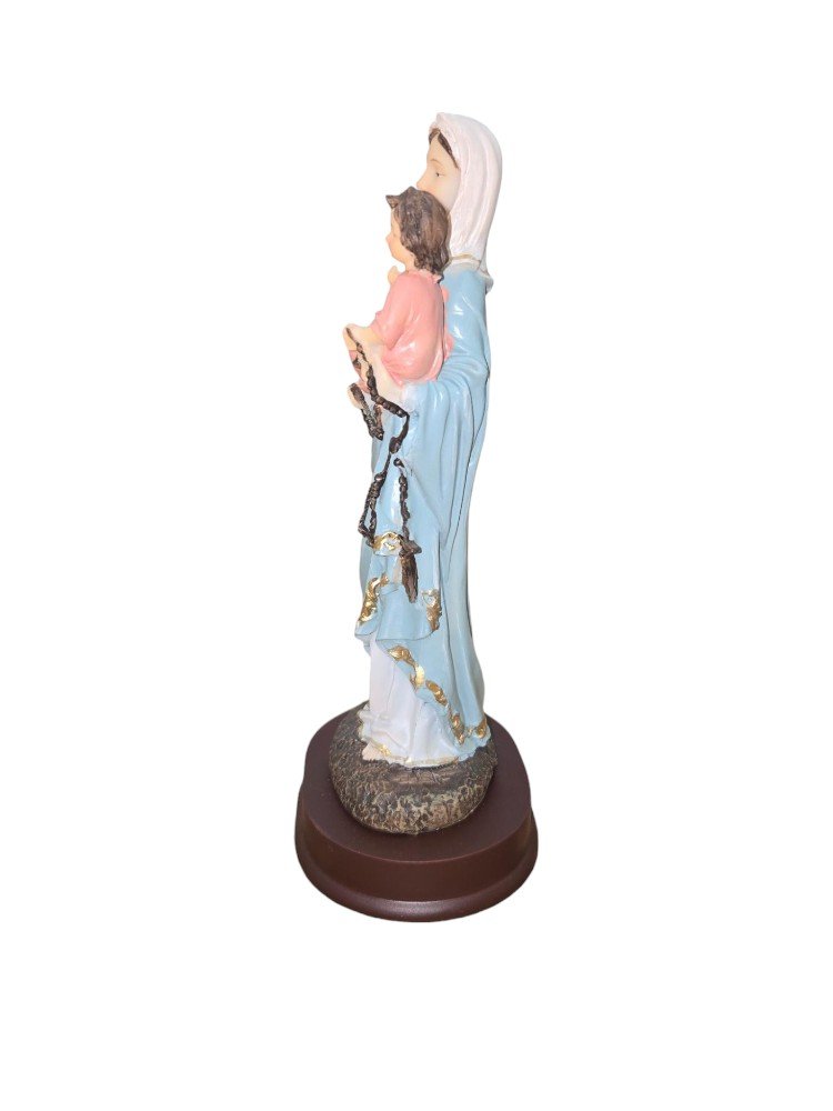 “This statue of Our Lady of the Rosary, meticulously crafted from resin, radiates a serene beauty. Hand-painted with gentle hues of blue, it captures the essence of Mary’s peaceful presence. Standing as a symbol of devotion and faith, this statue brings a sense of tranquility to any space it graces.”