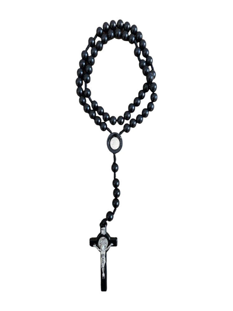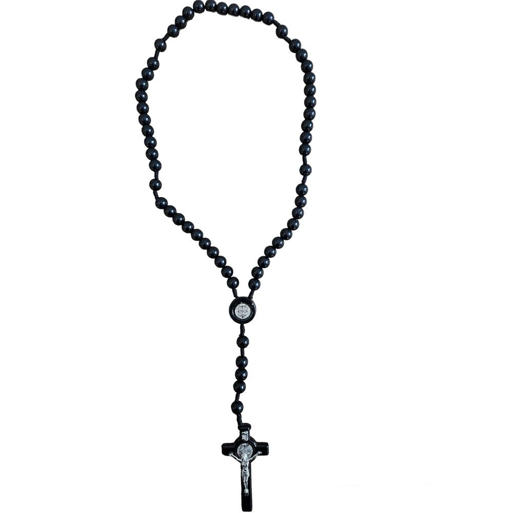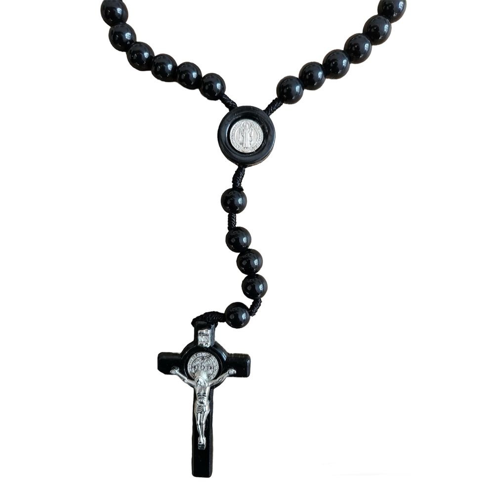 This St. Benedict black rosary features a black cord and measures 18” long and has a silver corpus.