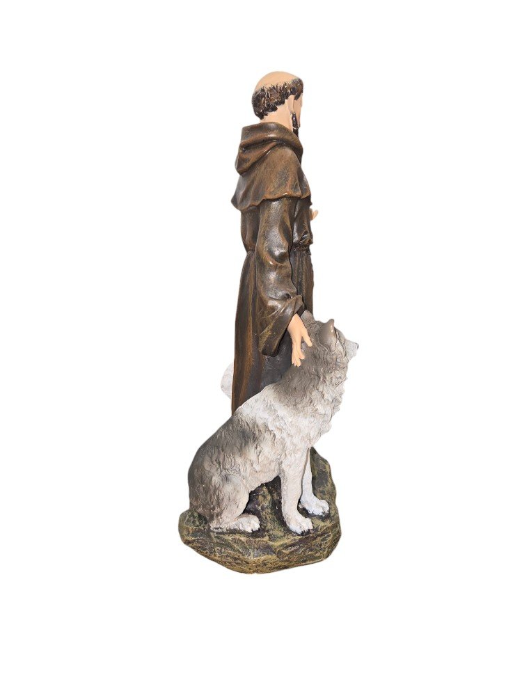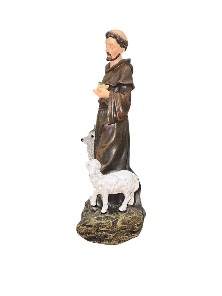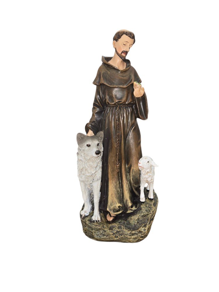 Crafted from durable resin, this lifelike depiction of Saint Francis of Assisi captures the essence of his humility and deep connection to all living creatures. With gentle features and a serene expression, he radiates compassion and divine love. The statue shows him surrounded by animals, symbolizing his reverence for nature and all of God’s creations. As the patron saint of animals and the environment, this image offers inspiration and solace to those who seek his intercession. This statue of Saint Francis of Assisi serves as a timeless reminder of his unwavering faith, his dedication to peace and poverty, and his role as a guardian of nature and protector of the vulnerable.