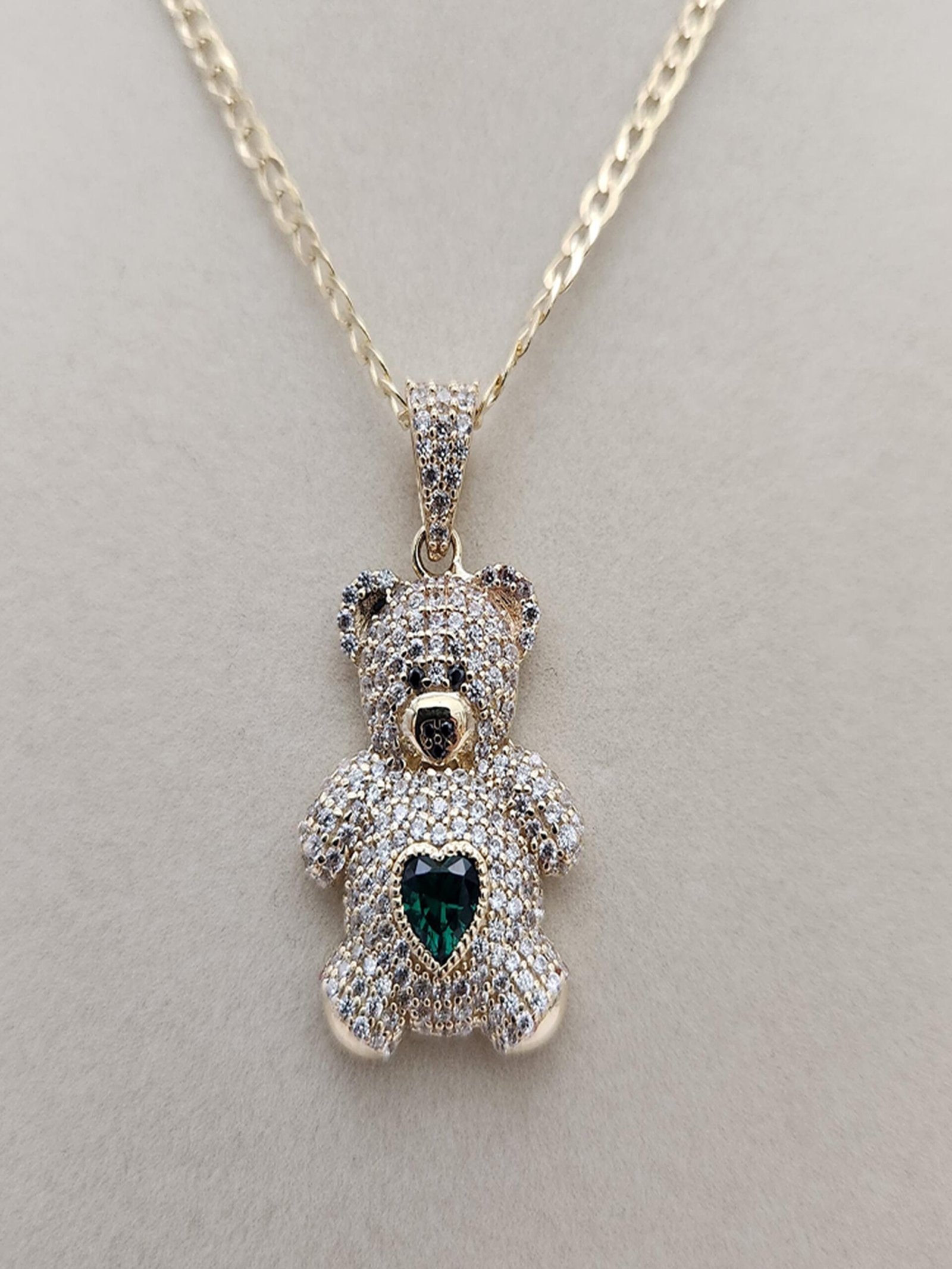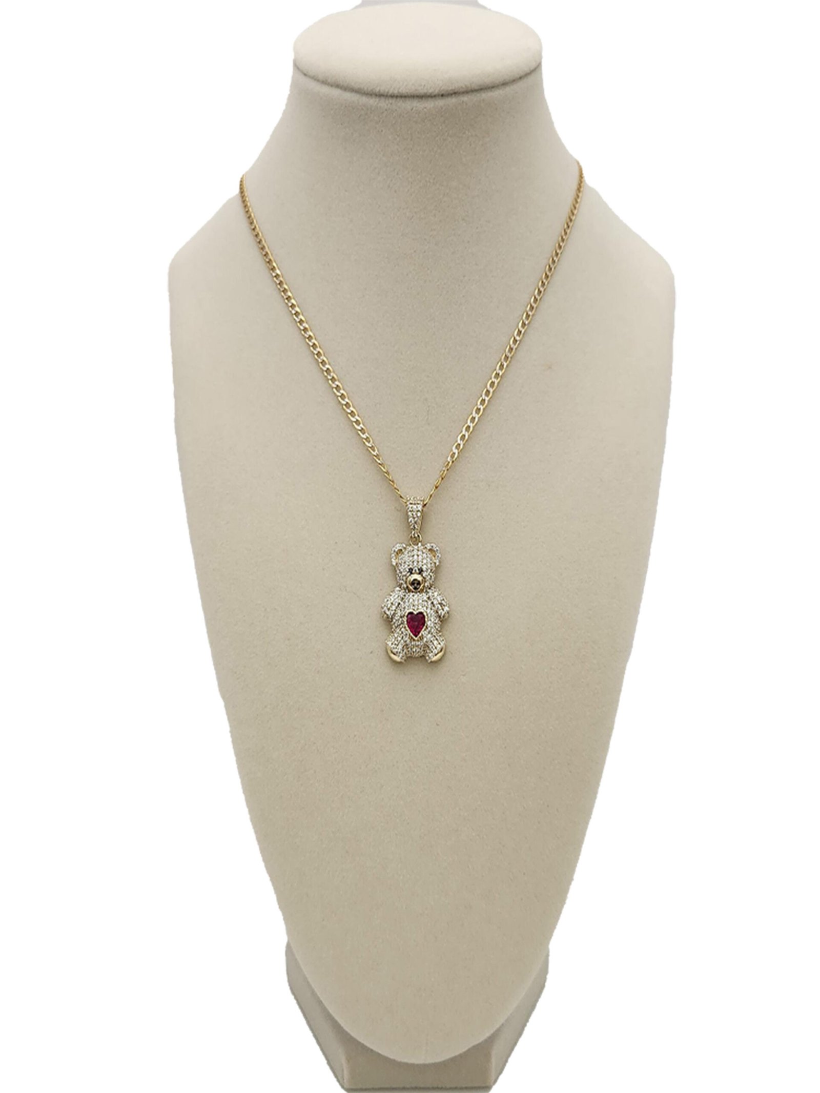 This cute Teddy Bear Pendant is made of 14K Italian gold and features a vibrant heart-shaped colored cubic zirconia stone for a playful, sparkling touch.
