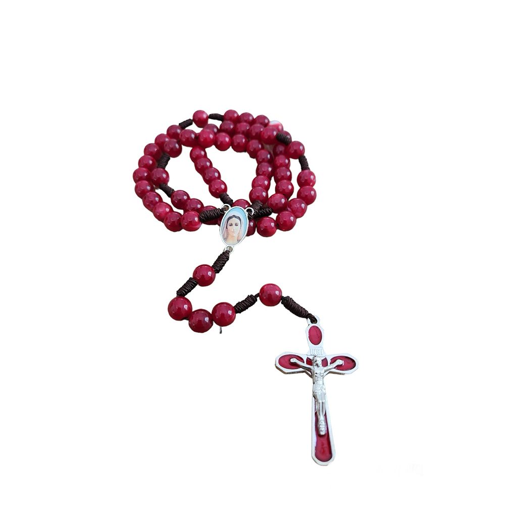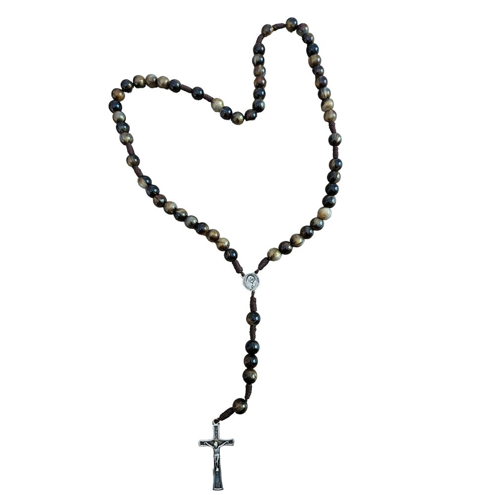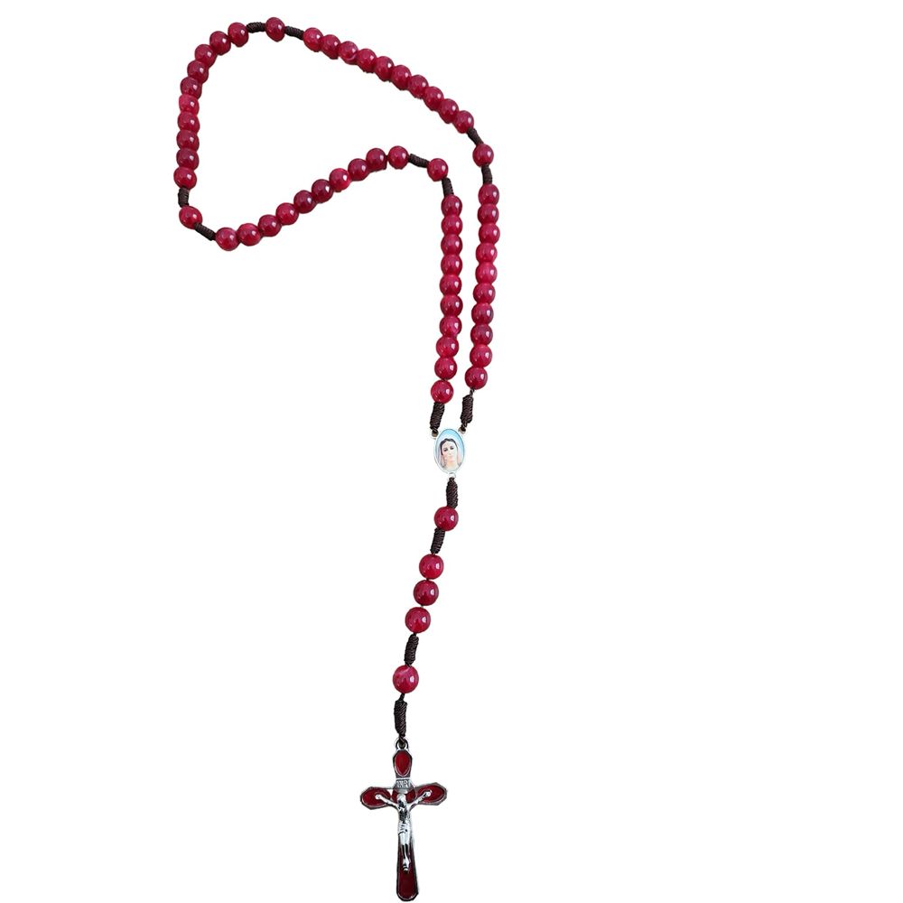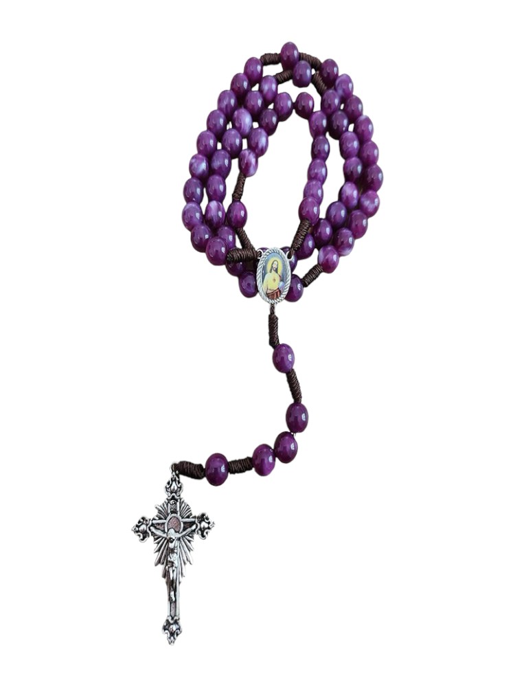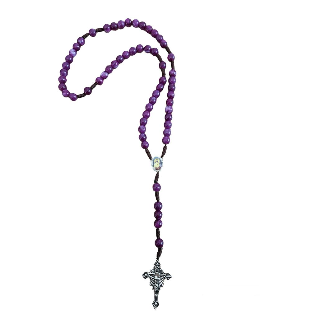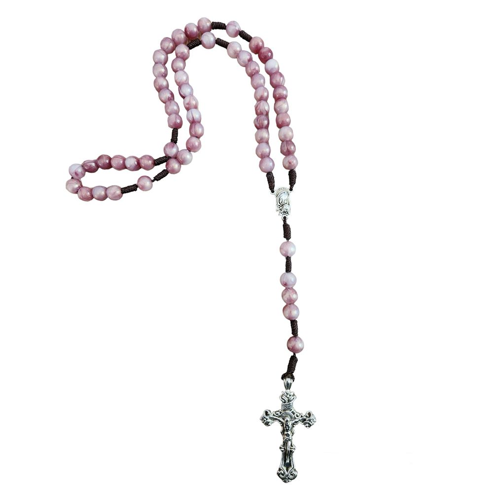 This acrylic rosary features a very strong brown cord and due to its size it can also be worn around the neck as a necklace.