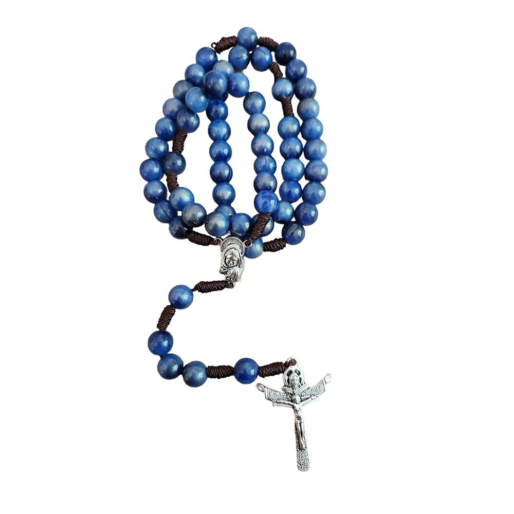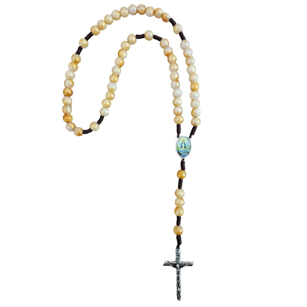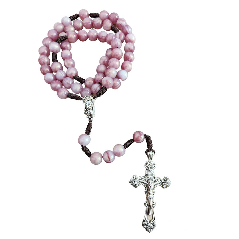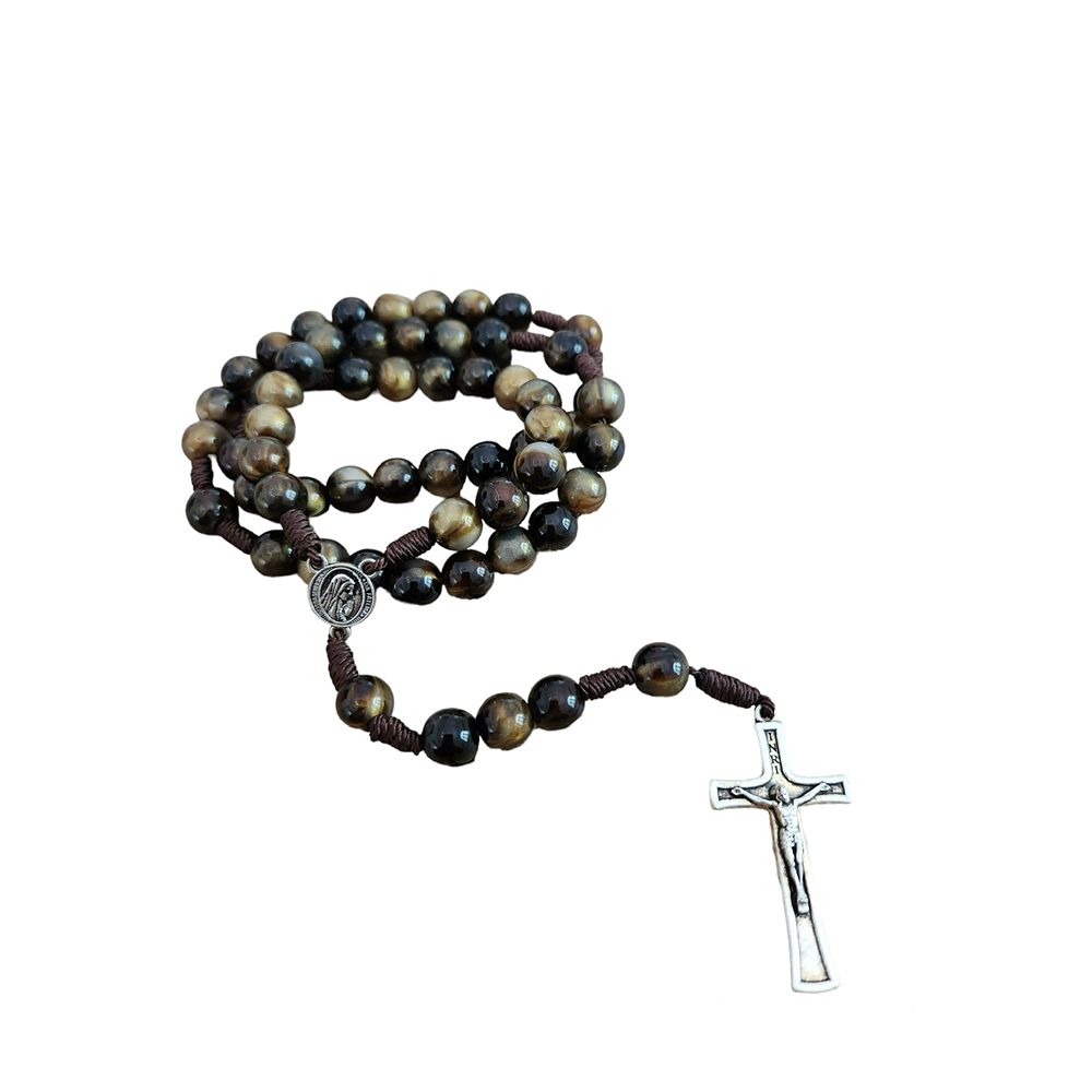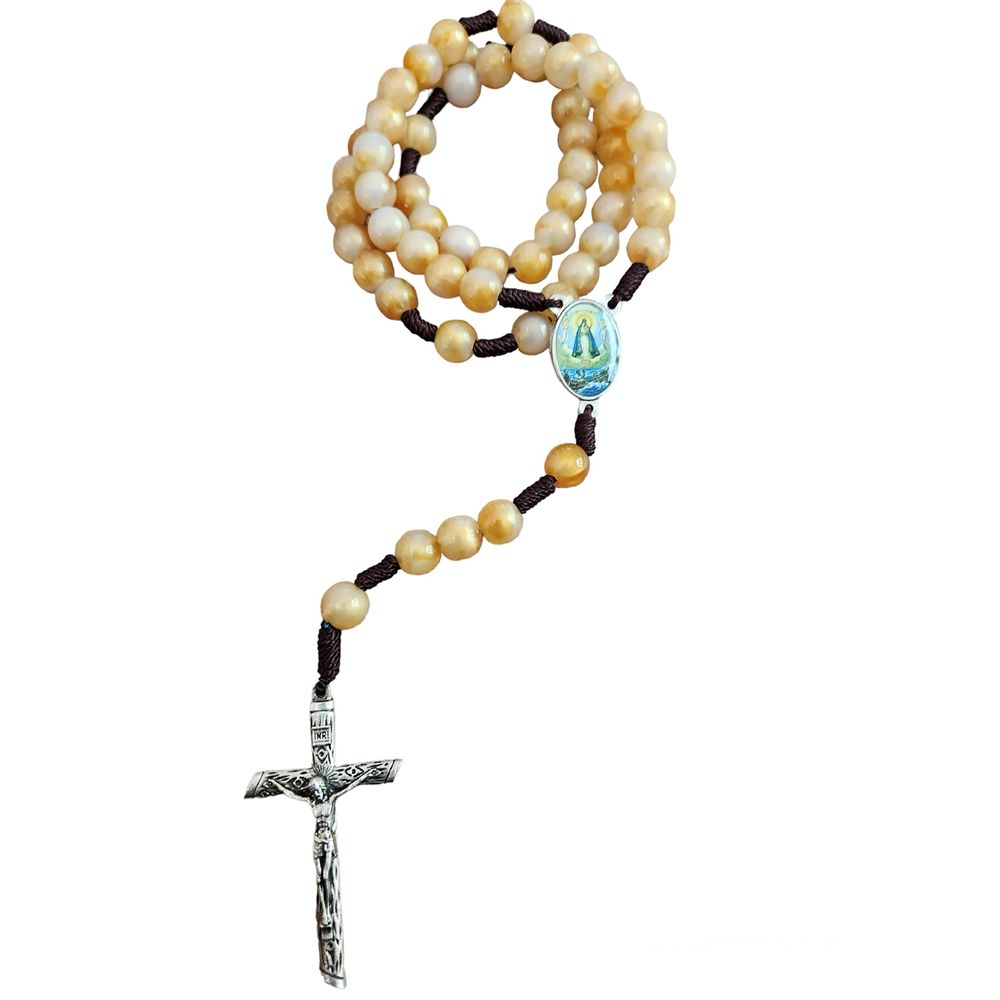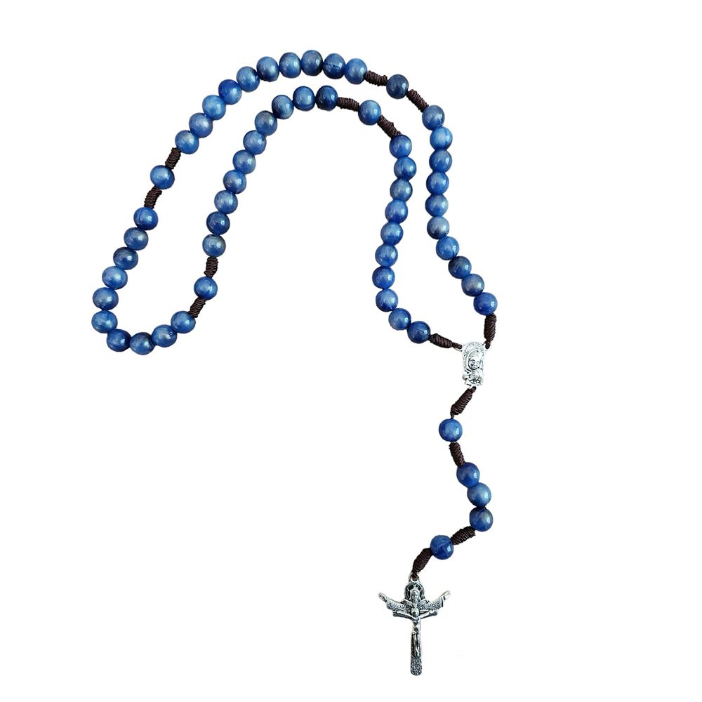 This acrylic rosary features a very strong brown cord and due to its size it can also be worn around the neck as a necklace.